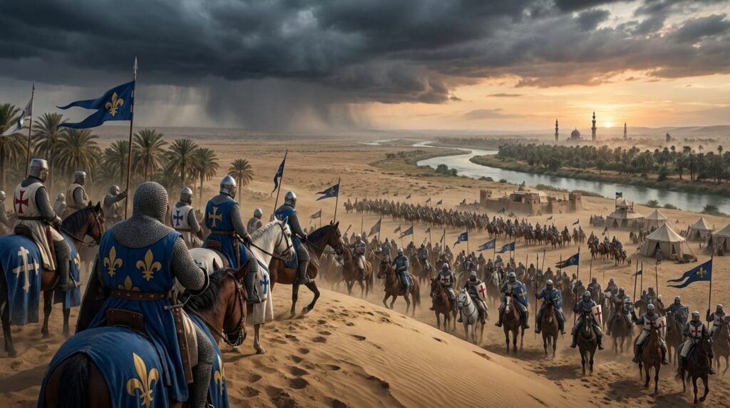 اتفاق سے اسی زمانے ساتویں صلیبی جنگ کی ابتدا ہو گئی۔ ساتویں صلیبی جنگ کی ابتدا فرانس کے بادشاہ لوئی نہم نے کی تھی۔ اس نے اپنے کام کی ابتدا اس طرح کی کہ مصر پر حملہ آور ہوا۔ وہ چاہتا تھا کہ پہلے مصر پر حملہ آور ہو اور آگے بڑھ کر پورے فلسطین پر قابض ہو جائے۔
